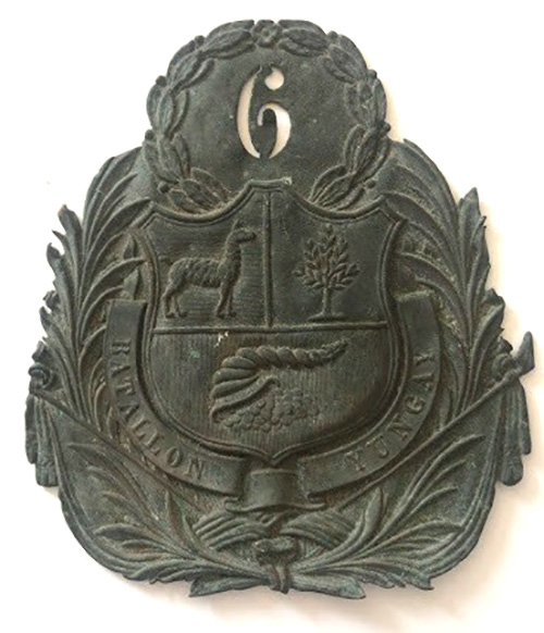 Es el decreto de 1835, el que coincide plenamente con la pieza materia de estos apuntes. Podemos entonces fechar esta placa entre la creación del batallón Yungay N° 6 por el decreto de diciembre de 1846, y la promulgación del Reglamento de Vestuario para todas las clases del Ejército y Armada por decreto de 28 de agosto de 1852, que estableció una distinta forma de los morriones con una chapa que “contenga entrelazadas en forma ovalada una palma y un laurel con el número del cuerpo colocado al centro; sobre esta de paño la escarapela nacional y un pompon encarnado: tendrán tambien carrilleras de hule sostenidas por dentro”.